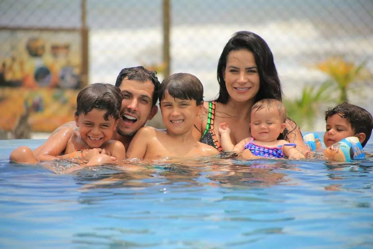 A apresentadora Lucilene Caetano e o cantor sertanejo Felipe Sertanejo escolheram um destino paradisíaco para suas férias em família: o Resort Cana Brava, localizado em Ilhéus, na Bahia. A viagem contou com a companhia dos quatro filhos do casal: Theo, Davi, Zian e a caçula Isabella Maria.