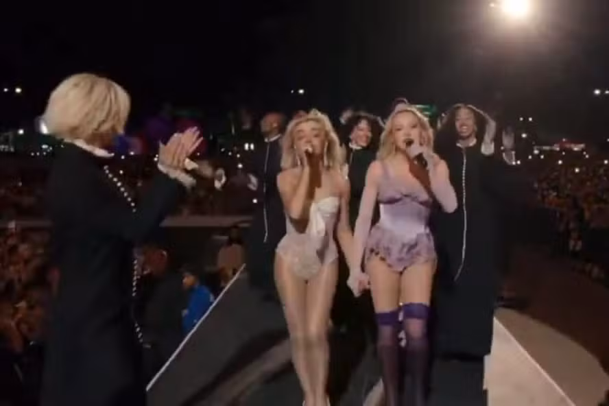 O momento exato da entrada de Madonna foi precedido por uma pergunta “safadinha” de Sabrina em sua música “Juno”, questionando “have you ever tried this one?”, em referência a uma posição sexual. Madonna, com sua maestria característica, respondeu entrando no palco ao som de um remix de “Vogue”, que começou com o icônico “name-dropping” de estrelas de Hollywood.